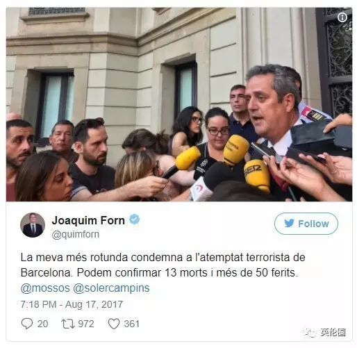 根据天空新闻报道,西班牙加泰罗尼亚区域内政部长Joaquim Forn已公开确认,今天在巴塞罗那发生的货车撞人事件已造成13人死亡,超过50人受伤。死亡者中包括一名被警方击毙的袭击者,而根据天空新闻、BBC News报道,地方政府称有80人在医院接受治疗。