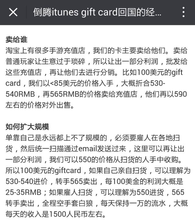 就是用低廉的成本,从非法途径购买非法礼品卡,然后高价卖给买家。
