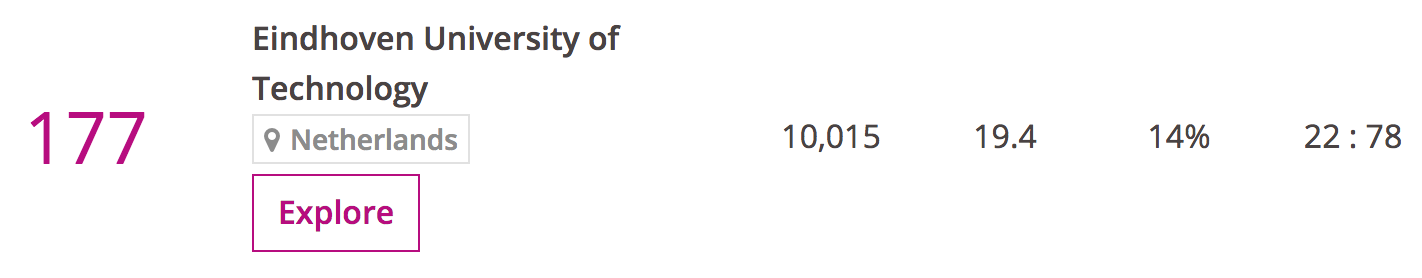 “泰晤士欧洲高校2016-2017排名榜单”显示,埃因霍温理工大学中,女生和男生的分配比例,竟然是22:78!