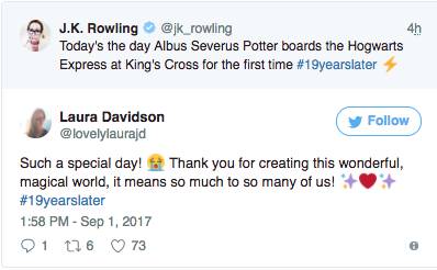 推特上很多网友,都表达了对这一天的纪念,他们转发并且回复作者JK罗琳的推特,并且表达了激动之情和对作者罗琳阿姨的感谢……