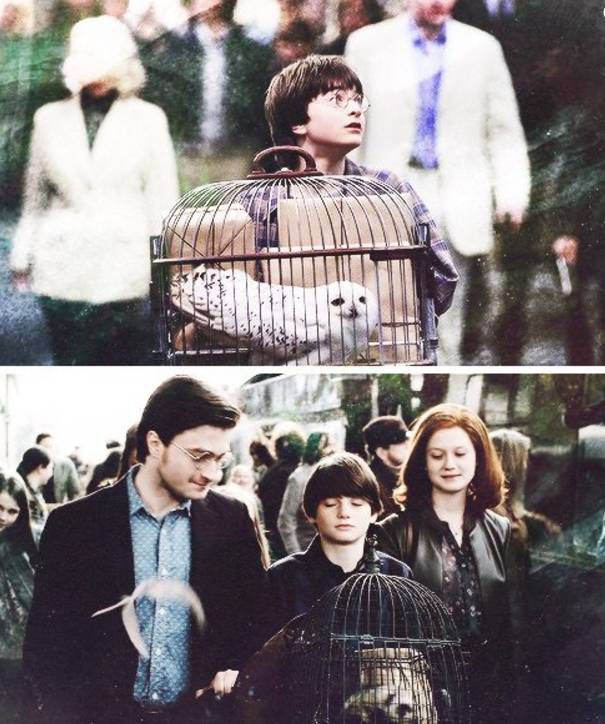 “看到这两张照片对比,我都哭出来了,詹姆和莉莉没能送小哈利去上学,但是哈利和金妮做到了。”