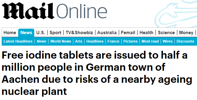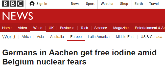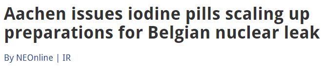此次是德国历史上首次向居民发放碘片,起因是有消息称,就在上个月,相距德国亚琛市70公里的、比利时两大核电站之一的蒂昂日(Tihange)核电站反应炉出现裂缝,非核心工作人员已撤离。