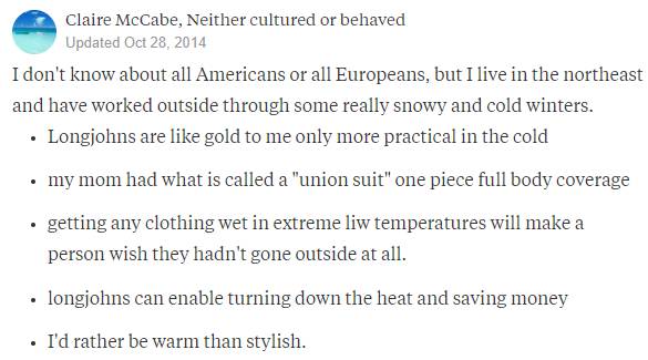 到了现代,无论是亚马逊还是各大百货,都有各种款式的秋衣秋裤,以此可以证明,老外确实是穿秋裤的,有人还把它们夸上了天。