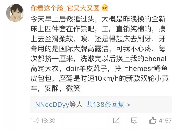 然后把自己全身行头都详细描写了一遍,“整套Burberry衬衫西服,香奈儿13寸的黑色高跟鞋”,还“偶尔看下卡地亚的表”,说明自己浑身都是奢侈大牌;