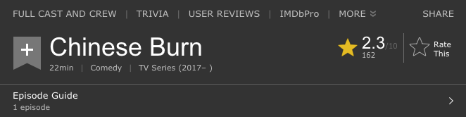 《Chinese Burn》目前在英国播放了一集,Imdb(西方的豆瓣)上的评价已经低至2.3/10分。相当于整个 IMDb 评分系统中的倒数第37名。