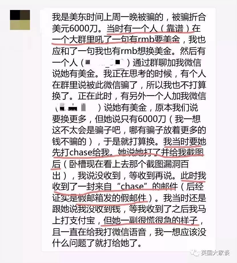 骗人手法还不止于此。去年3月,美国东西两岸留学生有数十人被“人民币换美金”骗钱。据北美留学生日报报道,骗子会在朋友圈散播“人民币换美金”广告,当有意者联系骗子,他们会以家人生病或者家里装修要钱等理由称自己急需人民币以此来骗财,金额从几千美金到几万美金不等。