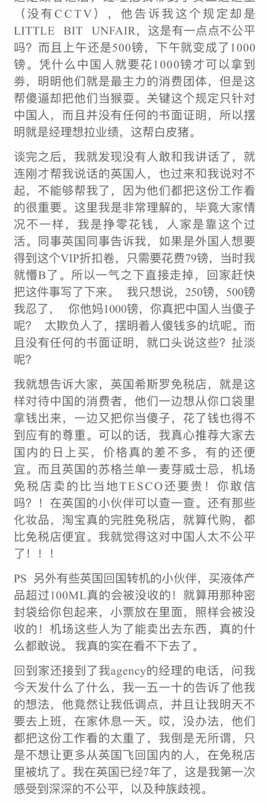 但是,昨日一位自称在英国伦敦希斯罗机场第二航站楼免税店打零工的中国留学生,爆料了这样一件事儿,迅速点燃了同胞们的愤怒情绪......