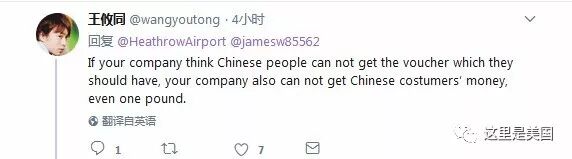 网友 @Bin Chen:我的天哪!真难以想象希斯罗机场是这样背后捅刀子的双面派。中国人要花1000英镑才能在免税店拿到一张优惠券,其他人就只需要79英镑?疯了吧?!嘿,希斯罗机场,祝您新年业绩大跌!