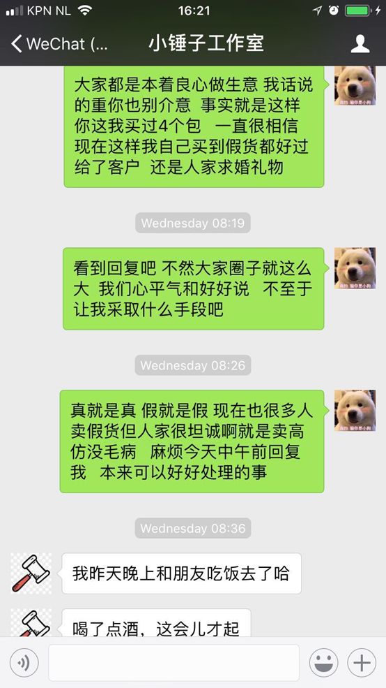 锤子提出,这包就是柜台买的!应该去找柜台的麻烦!并且表示没有耐心再回复我了,让我爱咋咋。