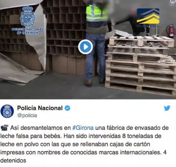 西班牙国家警察总局证实,近日,西班牙警方在与欧洲刑警组织的联合行动中,捣毁了一个包装假奶粉的地下工厂,并逮捕了四名波兰籍犯罪嫌疑人——而被缴获的假奶粉据信主要将销往中国。