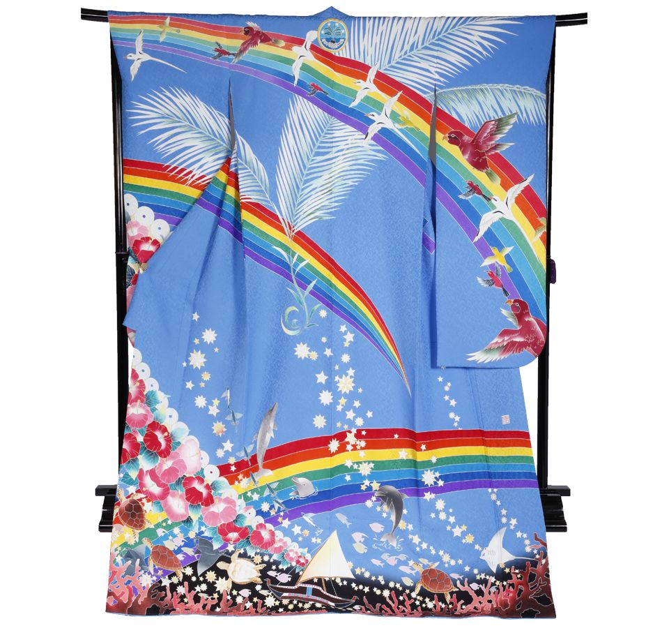 体现该国的和服图案为白色的环礁、闪耀的蔚蓝大海以及红、黄色的南国花朵。