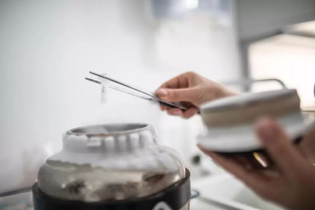 这些储存在零下196摄氏度的胚胎干细胞,迅速被从液态氧容器中取出,呈粉红色液体状。