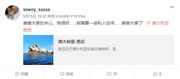“谢谢大家的关心,我很好......我需要一些私人空间......谢谢大家了”。字里行间透露的疑似应该已经停止了自杀行为...