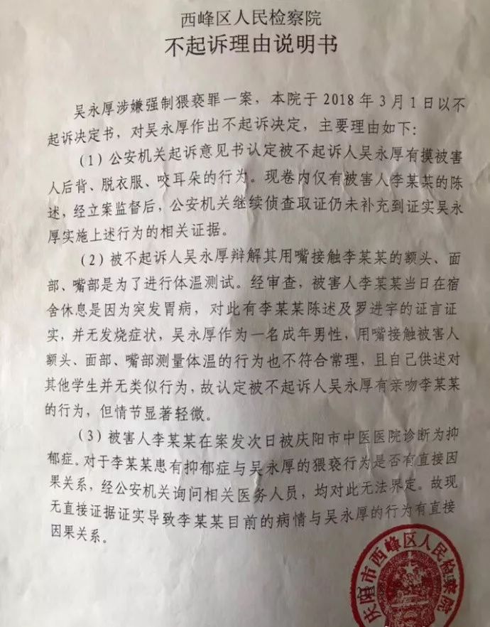 检察院最终还是认为吴某的行为轻微,且无法证明猥亵与李某抑郁症有直接关联,作出不起诉的决定!