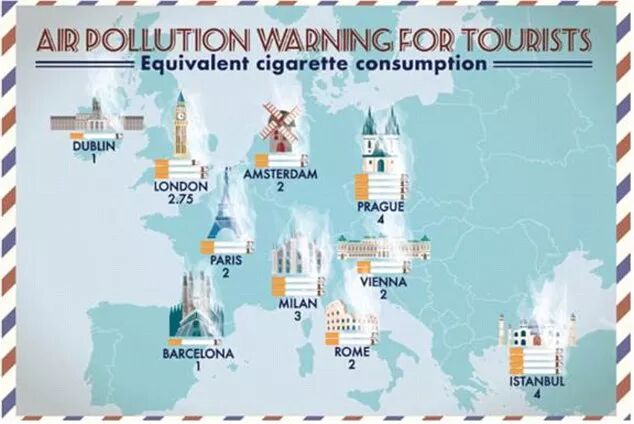 在巴黎、罗马、阿姆斯特丹、维也纳的短期旅程,相当于让你吸入了2支香烟。