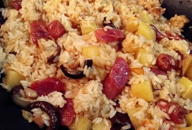1. 洗米后,按平时电饭煲蒸米饭的水量先把米泡上。 2. 香菇切丁,腊肠切丁,土豆切丁,一起放入电饭煲内按煮饭键。 3. 煮熟之后加入适合酱油和糖拌匀即可。
