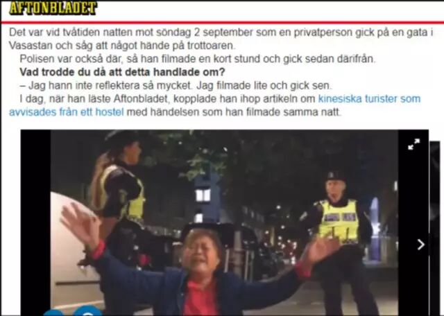 其中一位目击者表示:“瑞典警察没有任何粗鲁行为,他们只是试图平息整个事态,但中国游客却一直大声哭嚎,拒绝配合。”上述目击者还称,“中国人分明是在演戏,没有人对他做什么,她就扑倒在地上了。”