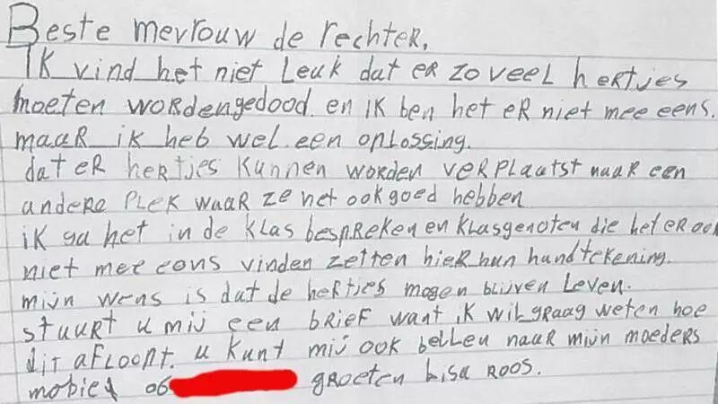 一名8岁的小学生Lisa Roos,去信乌特勒支法院的“法官女士”(mevrouw de rechter),陈述反对自然保护区Oostvaardersplassen射杀1800头马鹿的理由。乌特勒支法庭没有作答,但是,就派出一名新闻官,来到Lisa所在学校的班级作出解释。