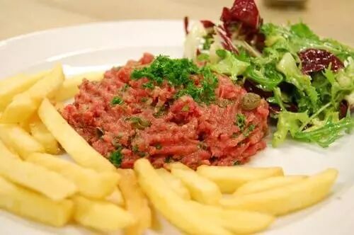 顾名思义,原材料是里脊肉(猪肉,牛肉,羊肉都可以),小酸豆,洋葱,沙拉酱还有各种调料。告诉你个秘密,里脊肉可是生肉哦。荷兰人同样沉迷于此,无法自拔。