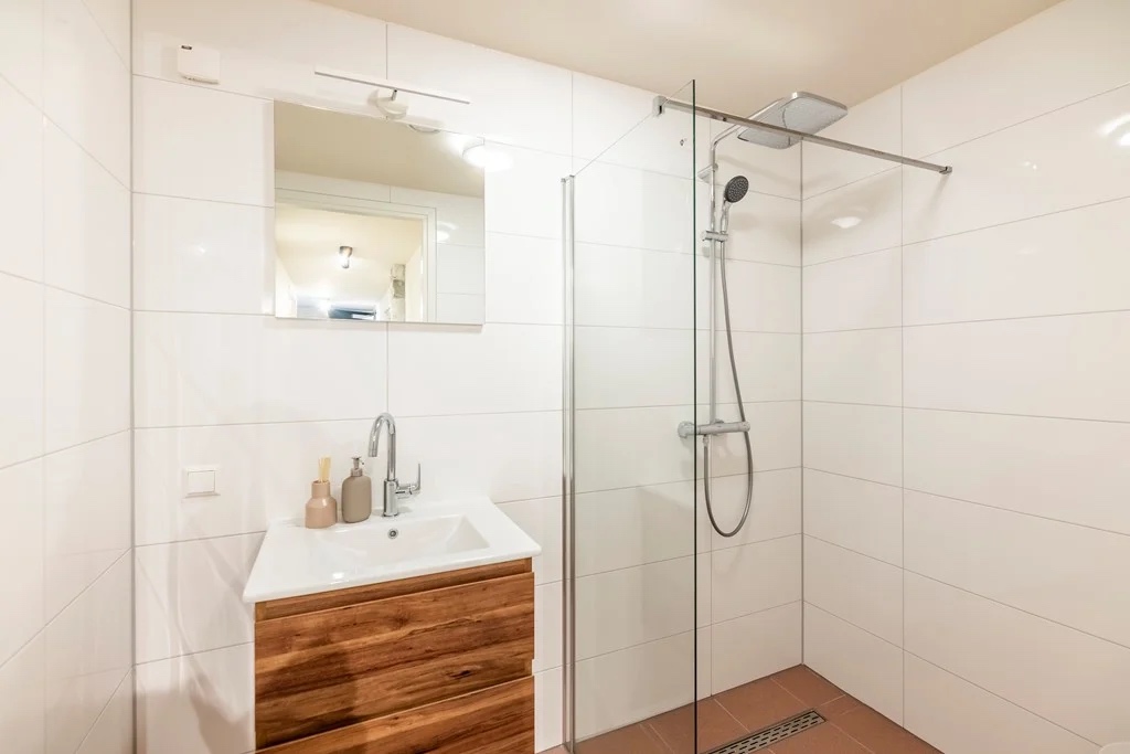 两室一厅,共67平,带家具,入口可通往所有房间,客厅配有放式厨房,组合烤箱、带抽油烟机的电磁炉、洗碗机、冰箱-冰柜和一个大水槽,主卧配有一张双人床、床头柜和衣柜。第二间卧室稍小,配有书桌和沙发床。浴室配有步入式雨淋花洒、带镜子的洗手台和毛巾架。卫生间是独立的,并配有一个小洗手池。