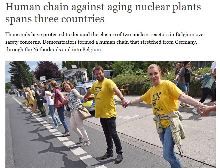 荷兰、德国、比利时三国居民手拉手形成“人墙”,共同抗议、要求比利时政府关闭不达标的核电站。