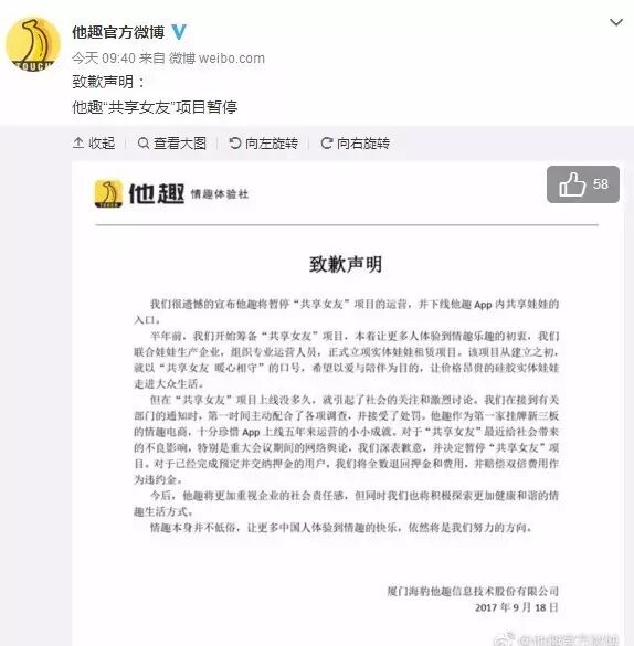 ▲公司在微博上致歉,宣布暂停“共享女友”