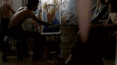 有的时候为了赶一笔订单 他们会熬整个通宵 乏了就抽一根烟 实在坚持不住就席地而睡 打个盹在接着画 画室就像家一样 所有的行动都可以在 那个狭小拥挤的房间进行