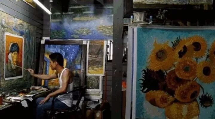 我崇拜梵高为艺术燃烧的人生 但我也能理解大芬村的赵小勇们 他们曾经为了生计 不得不一天又一天地模仿梵高 为了让自己活下去 不得不一遍又一遍地 画着自己并不理解的画