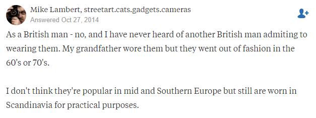 作为一个英国人,我是不穿秋裤的,我也从没听过其他英国人承认他们穿秋裤。我家就我爷爷会穿,秋裤这玩意儿在60、70年代就过时了。