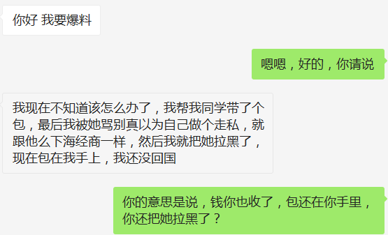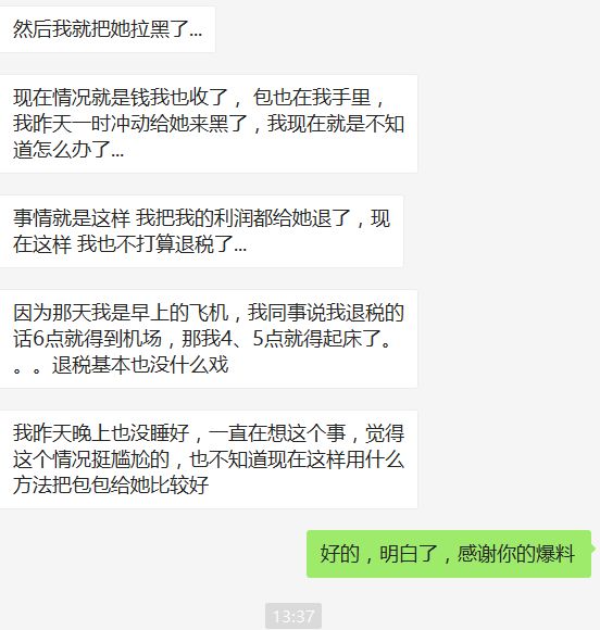 钱收了,包买了, 但是把付钱的人拉黑了, 撕逼之后,接下来该怎么办? 以下为女生自述...