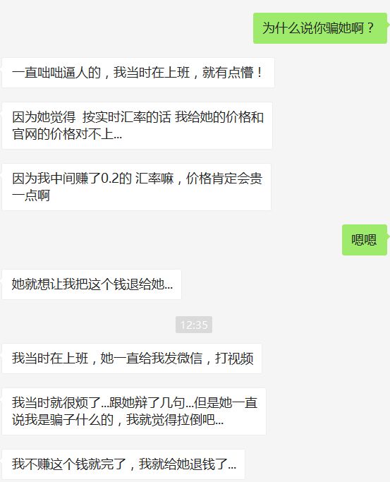 “你少退我36.56人民币, 你以为我不会查汇率啊!”