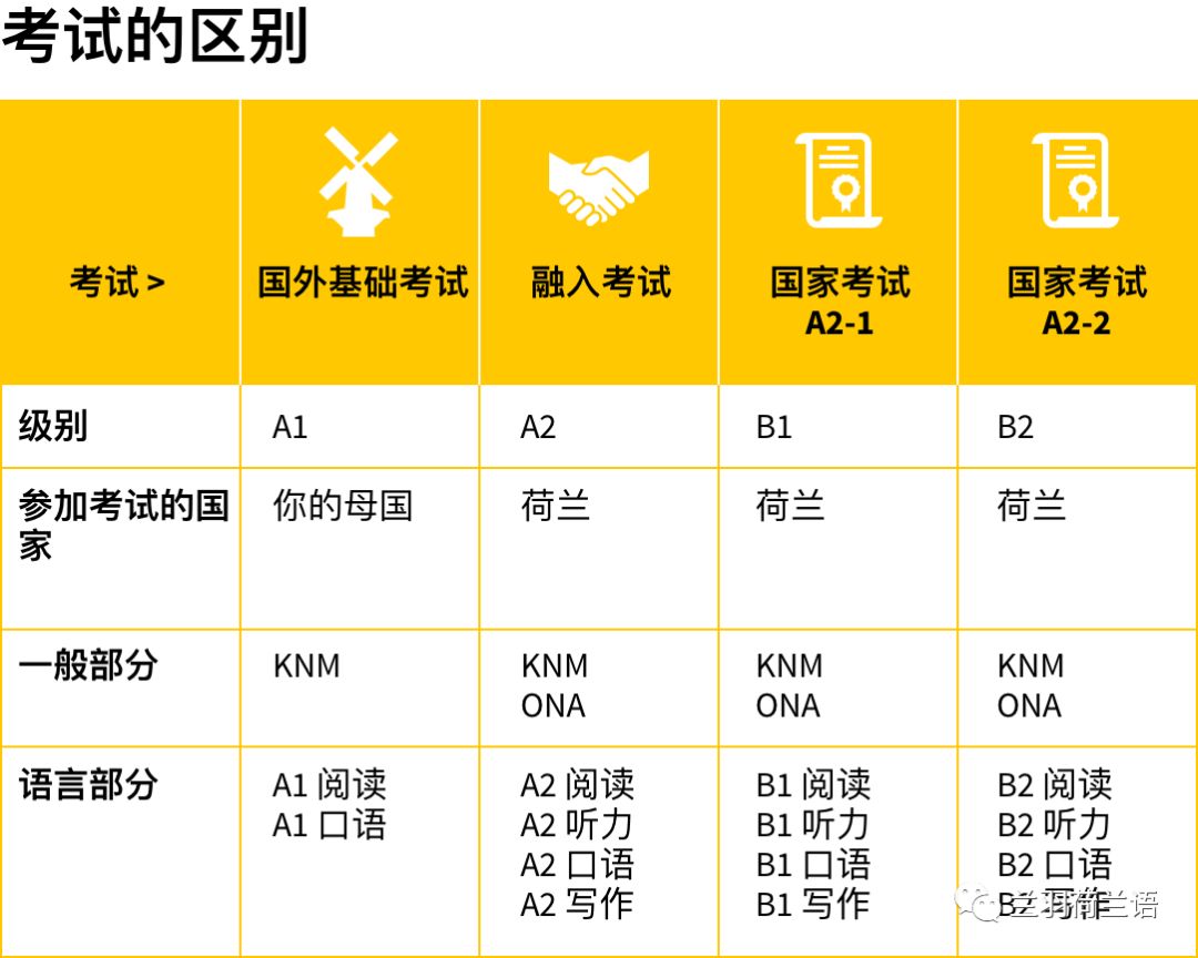 NT2国家级考试包括哪些内容? 两类考试均包括四个部分: --阅读 --听力 --口语 --写作 以上四个部分是可以分开考试的独立部分,每通过其中的一项考试,将获得证书,表示成绩合格,当考生获得全部四个部分的证书后,即可获得 NT2国家级考试文凭( B1及B2 )。 因此,你们发现了吗?既然参加融入考试需要A2水平,那如果我直接拿到B1的证书,即达到了融入荷兰社会的语言水平,又可以朝着更高的语言水平B2,继续学习,融入&工作统统搞定,何乐而不为呢!