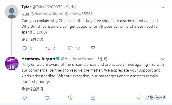 网友 @Bin Chen:我的天哪!真难以想象希斯罗机场是这样背后捅刀子的双面派。中国人要花1000英镑才能在免税店拿到一张优惠券,其他人就只需要79英镑?疯了吧?!嘿,希斯罗机场,祝您新年业绩大跌!