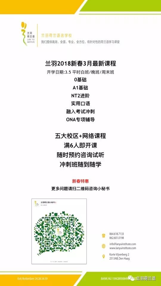 新春优惠活动第二波--凡参与活动并且获赞数达60及以上的同学,即可获得30欧课程优惠券,此券适用于除私课外的所有课程(详细课程请看下图)。 活动时间:2018.02.26-2018.03.03 截止日期:截至2018年3月3日下午荷兰时间17:00,截图发给兰羽小秘书 优惠券不能叠加使用,本次活动最终解释权归兰羽荷兰语学校所有。