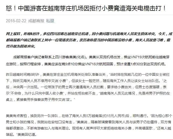 早在前两年,《华西都市报》报道,一群四川游客从越南芽庄出境时就被强索“小费”,越南边检人员甚至用中文直接喊“10元、10元”,一位“不配合”的游客不但被推搡暴力对待。