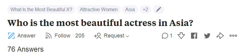 美国问答平台Quora 有“谁是最美的亚洲女星”这个问题。