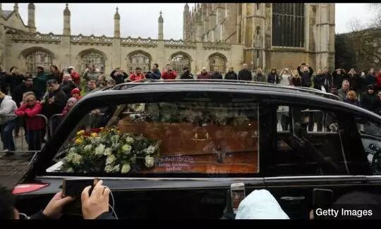 这场葬礼大约有500位亲友和同事受邀,在他们抵达教堂的过程中,大钟敲了76下,代表着霍金生前活过的每一年。