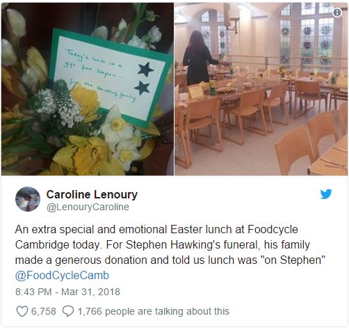 本周一,英国慈善机构 FoodCycle收到了一份来自霍金家族的特殊的礼物。这份礼物是邀请50名无家可归的人去Wesley Methodist Churchy(英国剑桥城区的教堂) 吃复活节大餐。