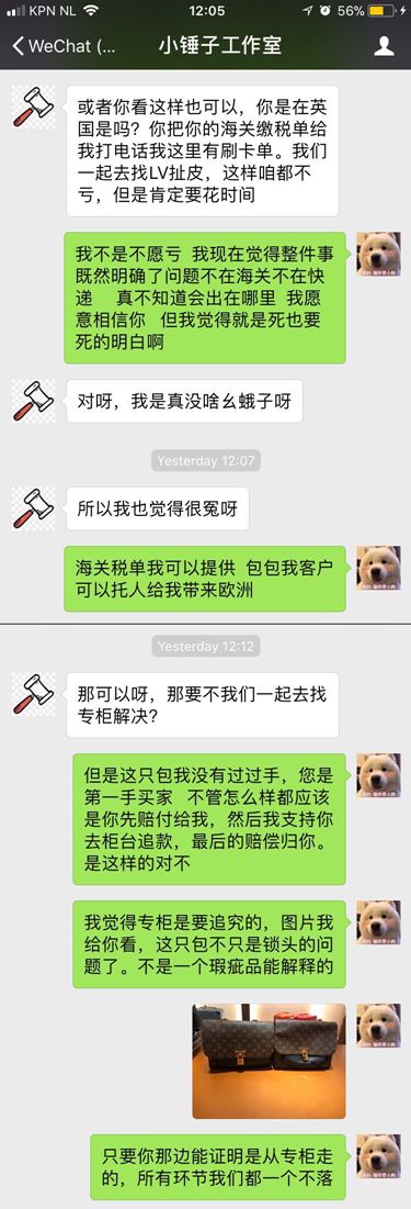 锤子提出,这包就是柜台买的!应该去找柜台的麻烦!并且表示没有耐心再回复我了,让我爱咋咋。