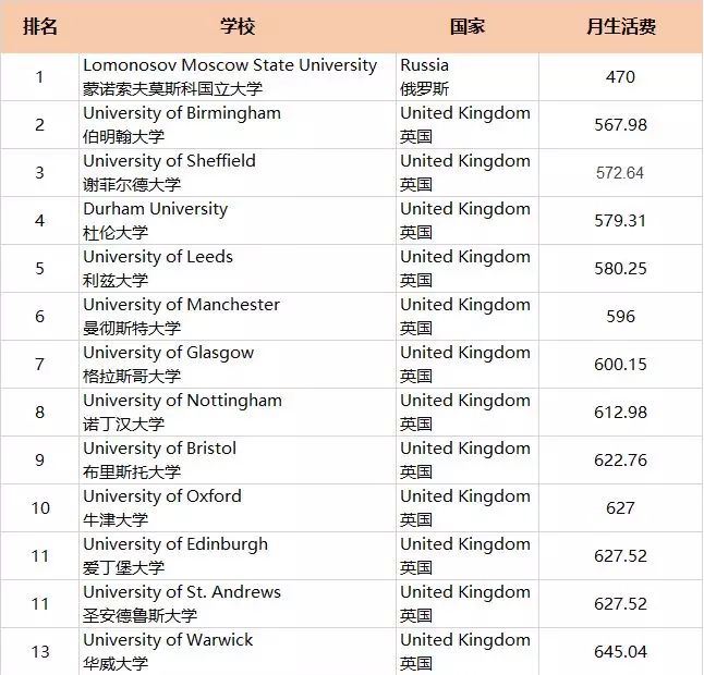榜单是从生活费最低到最高来进行排序的。除了第1名蒙诺索夫莫斯科国立大学(Lomonosov Moscow State University),以每个月470英镑的最低生活费高居榜首,榜单的前13名全是英国的高校。