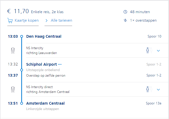 比如,从海牙中心火车站到阿姆斯特丹中心火车站,单程需要11.7欧元,但是拥有一张打折卡,您就只需要花7.02欧元,足足省了4.68欧元!一趟来回的旅程,就可以为您省下将近10欧元的费用。