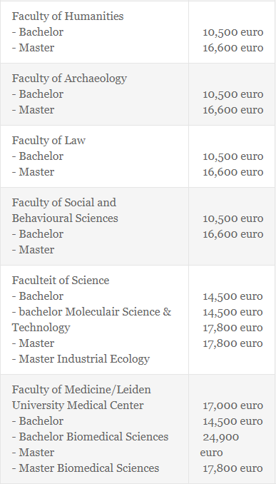 以下,仅以荷兰莱顿大学的学费为例: