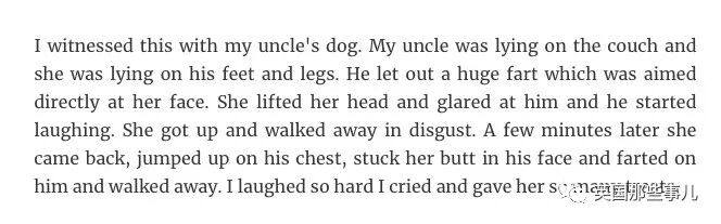 几分钟之后,狗子回来了,跳到我叔叔的胸口,把屁股对着他的脸,放了个大大的屁,然后傲娇得离开了。