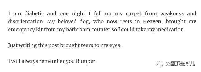 我有糖尿病。有一天,我突然发病,感觉全身无力眩晕,一下子倒在了地毯上。我亲爱的狗狗,马上去卫生间把我的急救箱拿过来给我。