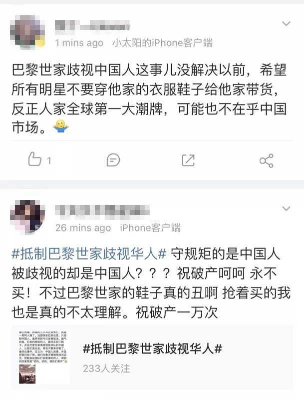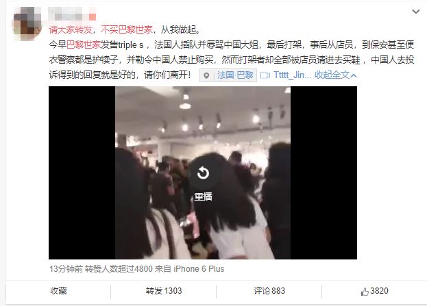 巴黎世家店员:中国人出去!别再来买鞋了!