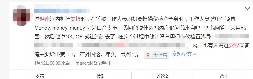 有网友表示,在河内机场过安检时,工作人员嘴里一直念着,
