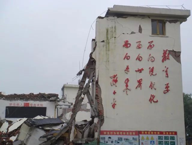 她后来听说, 张老师用身体抵着门框, 左手托墙,右手拼命地往外拉同学, 直到头顶的废墟轰然塌下,将他淹没…… 这个距离逃生门口最近的张家春老师, 用生命救出了八名学生。 ▲ 地震后倾颓的学校