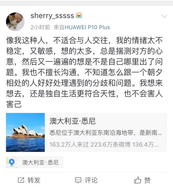 像我这种人,不适合与人交往,我的情绪太不稳定,又敏感,想的太多,总是揣测对方的心意,然后又一遍遍的想是不是自己哪里出了问题。我也不擅长沟通,不知道怎么跟一个朝夕相处的人好好处理遇到的分歧和问题。我想来想去,还是独自生活更符合天性,也不会害人害己。
