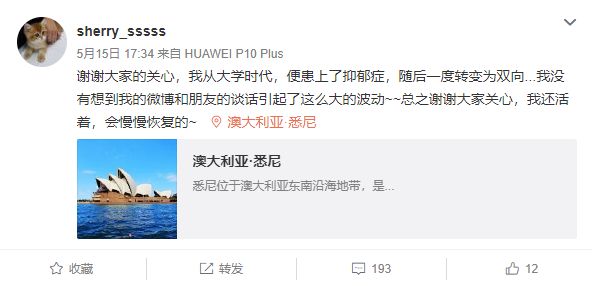谢谢大家的关心,我从大学时代,便患上了抑郁症,随后一度转变为双向...我没有想到我的微博和朋友的谈话引起了那么大的波动,总之谢谢大家的关心,我还活着,会慢慢恢复的。
