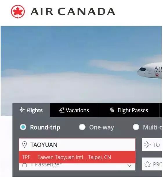 加拿大航空的官网上,英文、中文、德文三种语言的订票系统已经加注了中国台湾字样。